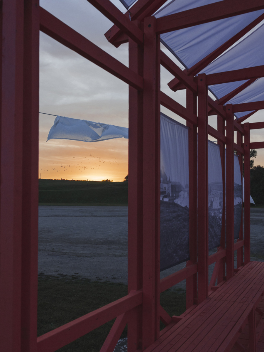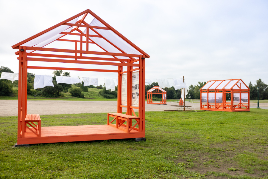 Until mid-October, a temporary installation on the Plains highlights the history of the Cove Fields and the many families who lived there. Wooden structures were inspired by the original huts that once served as homes.